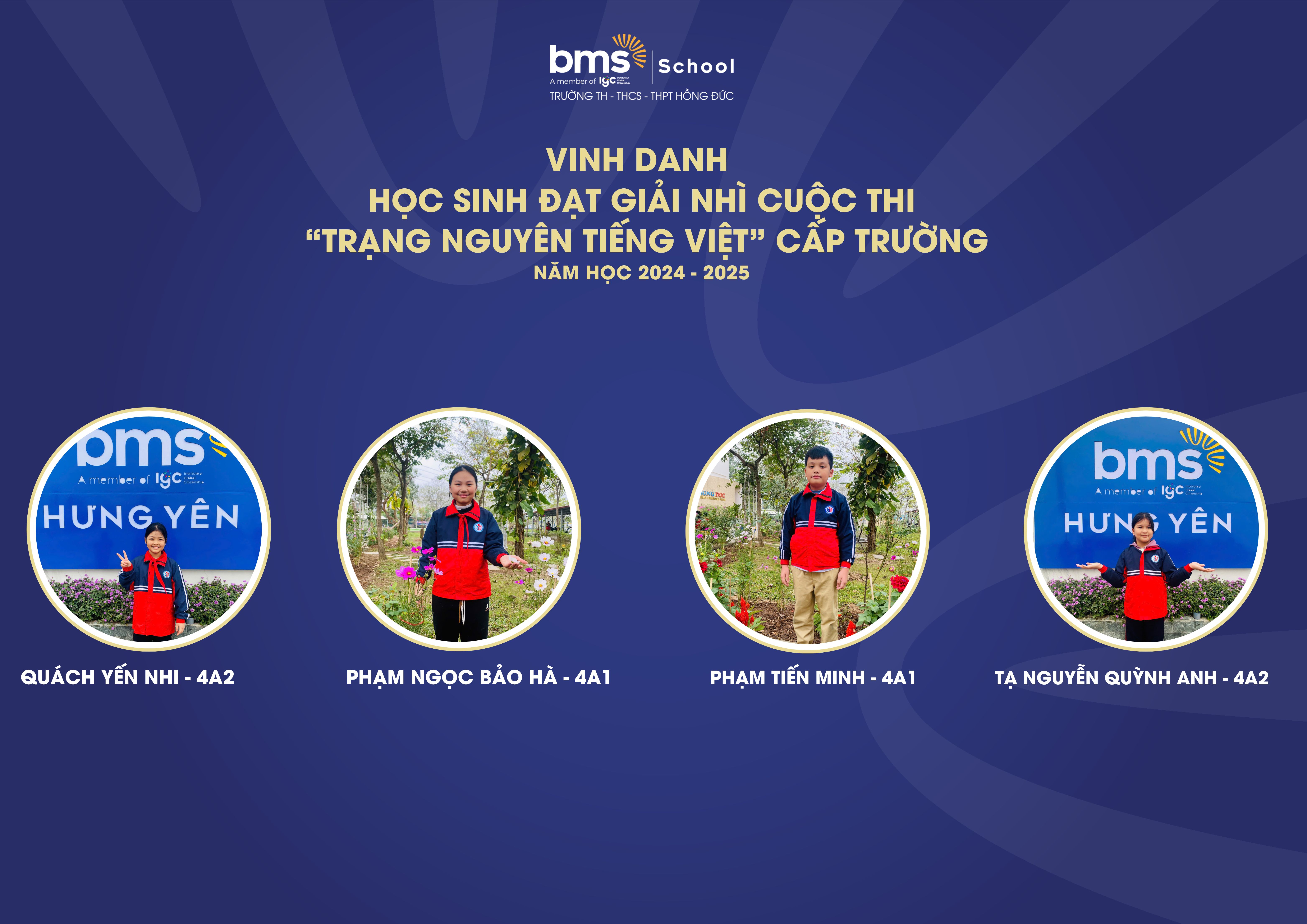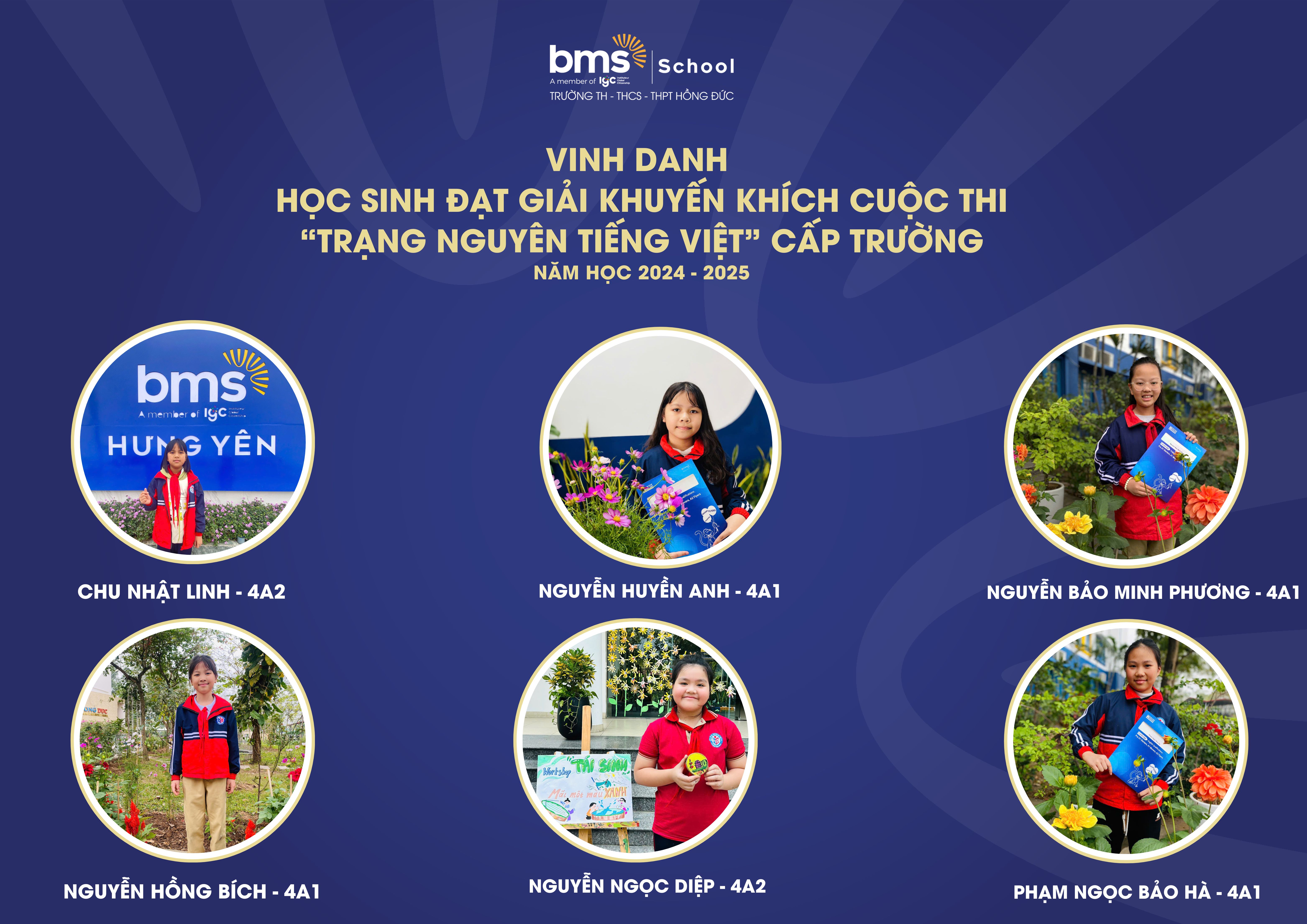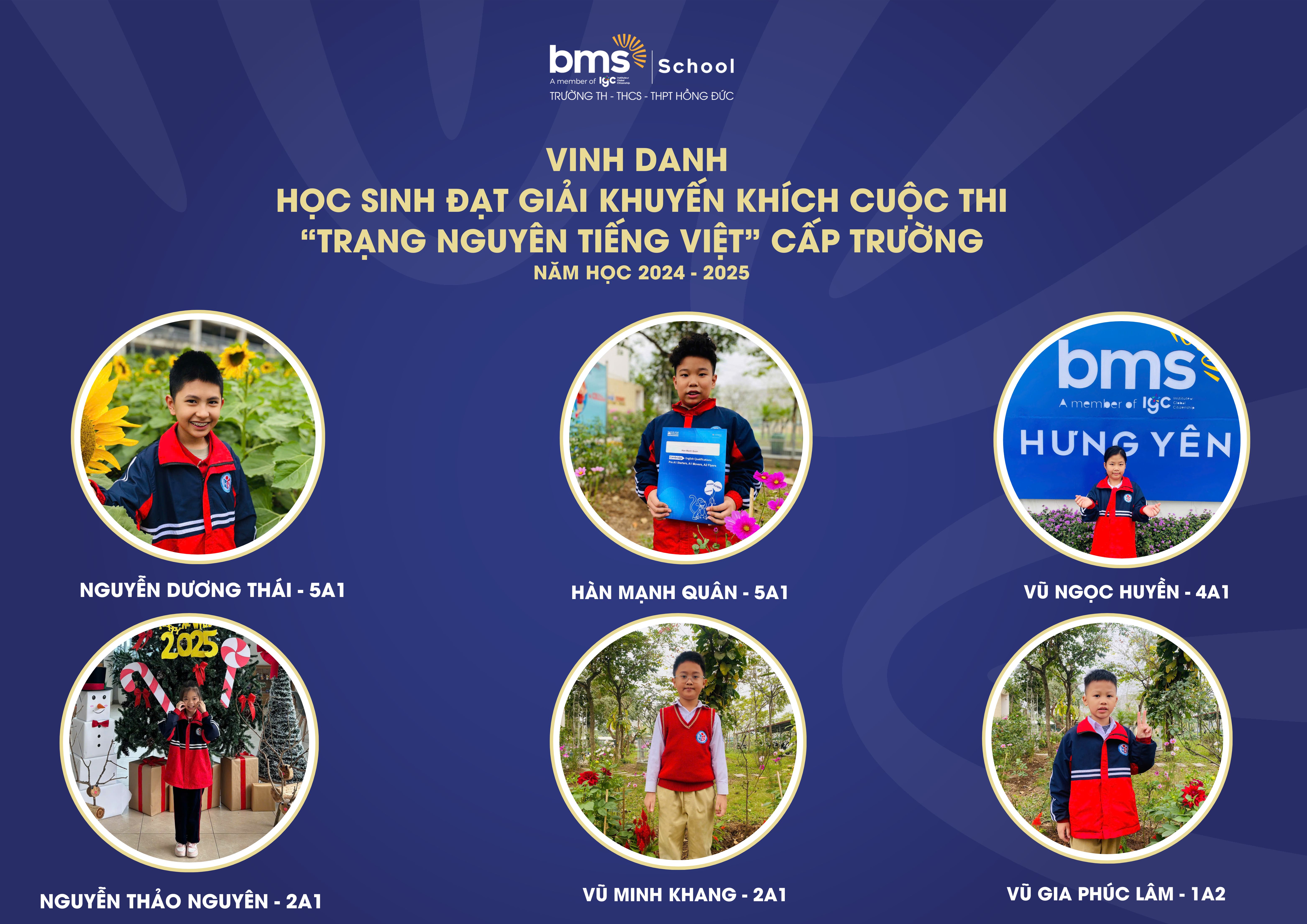 Kì thi Trạng Nguyên Tiếng Việt cấp Trường đã diễn ra thành công tốt đẹp, thu hút sự tham gia nhiệt tình và nghiêm túc của các BMSers Hưng Yên và đã gặt hái được những thành tích đáng tự hào với 7 giải Nhất, 9 giải Nhì, 12 giải Ba và 21 giải Khuyến khích như sau: