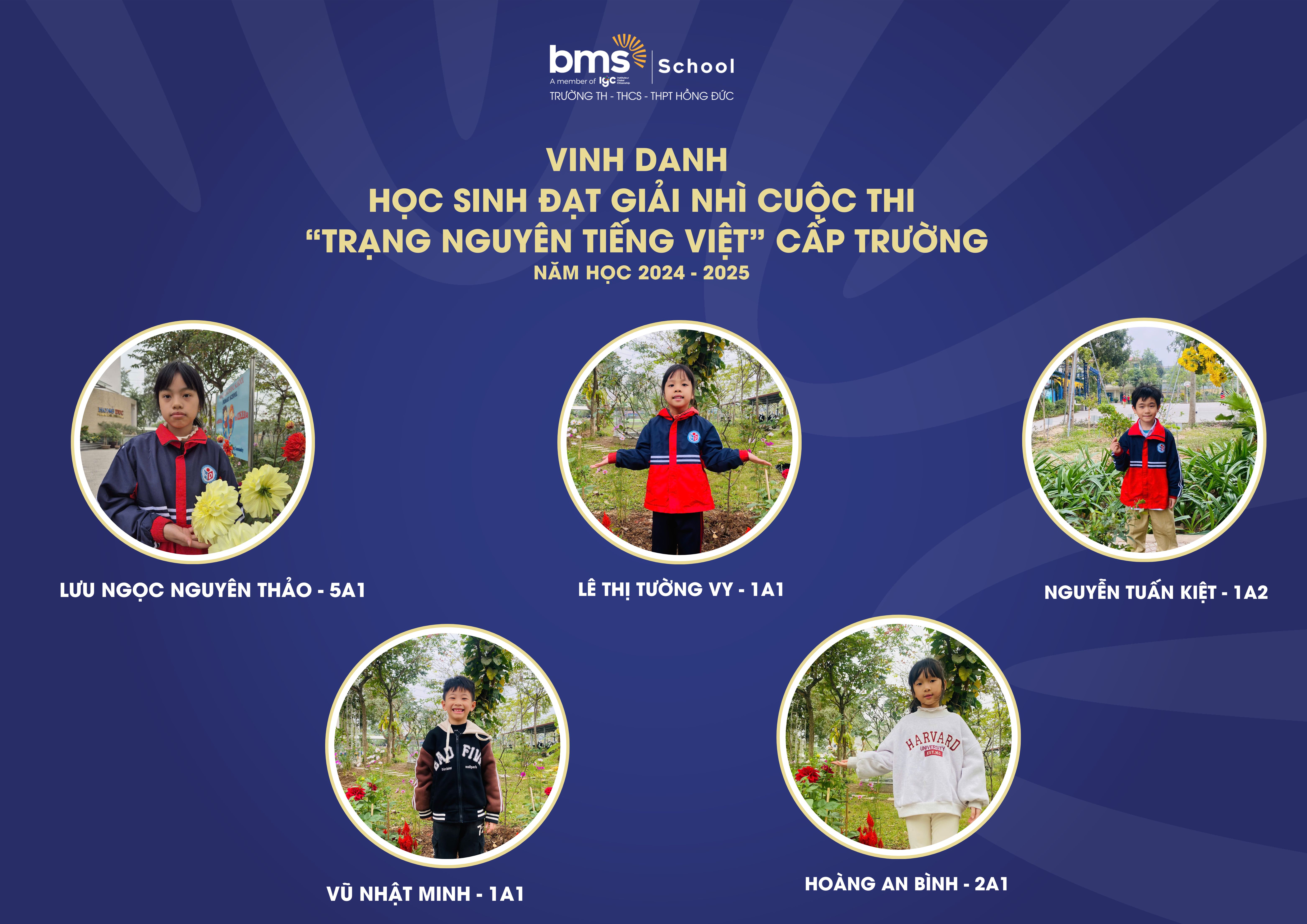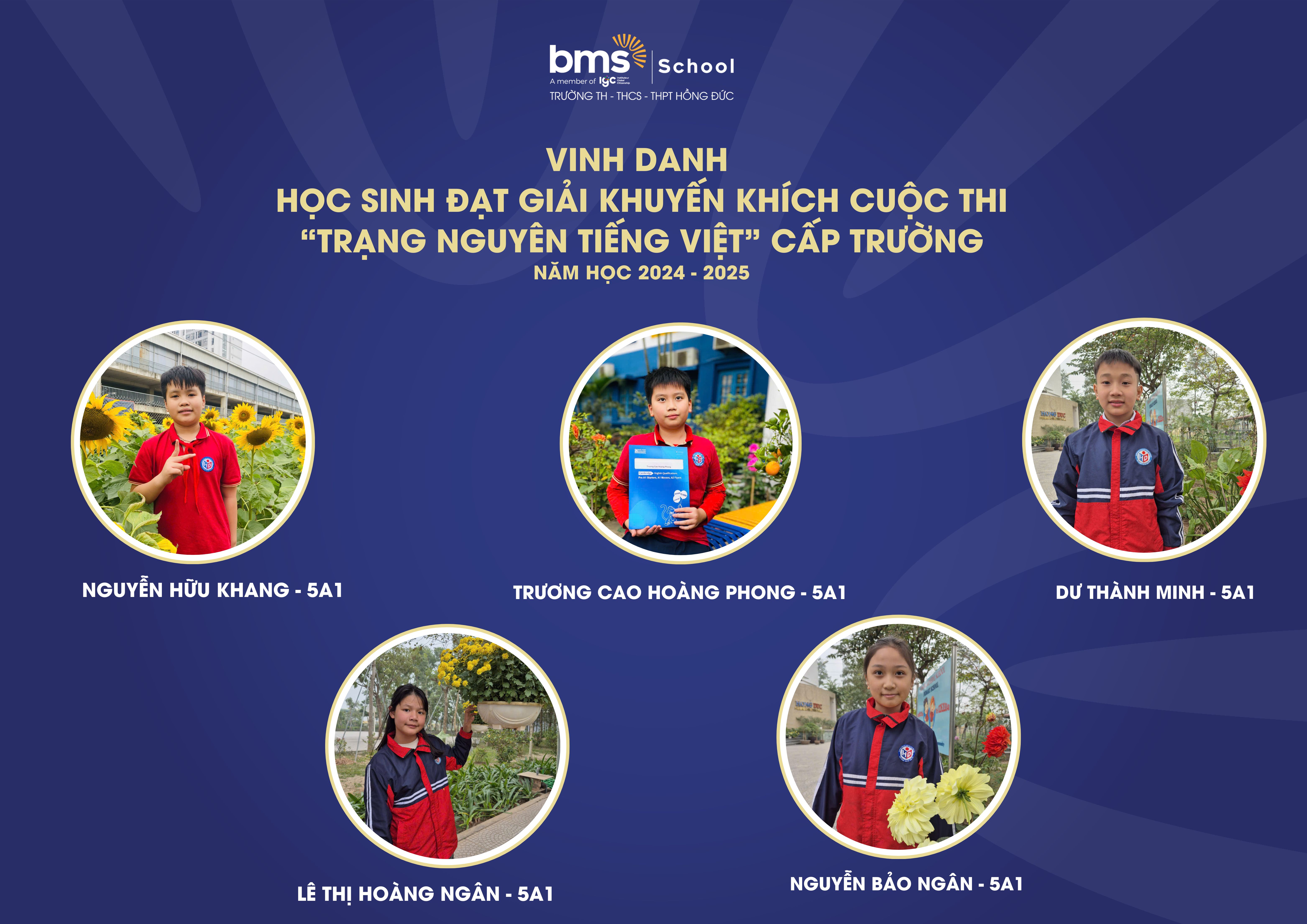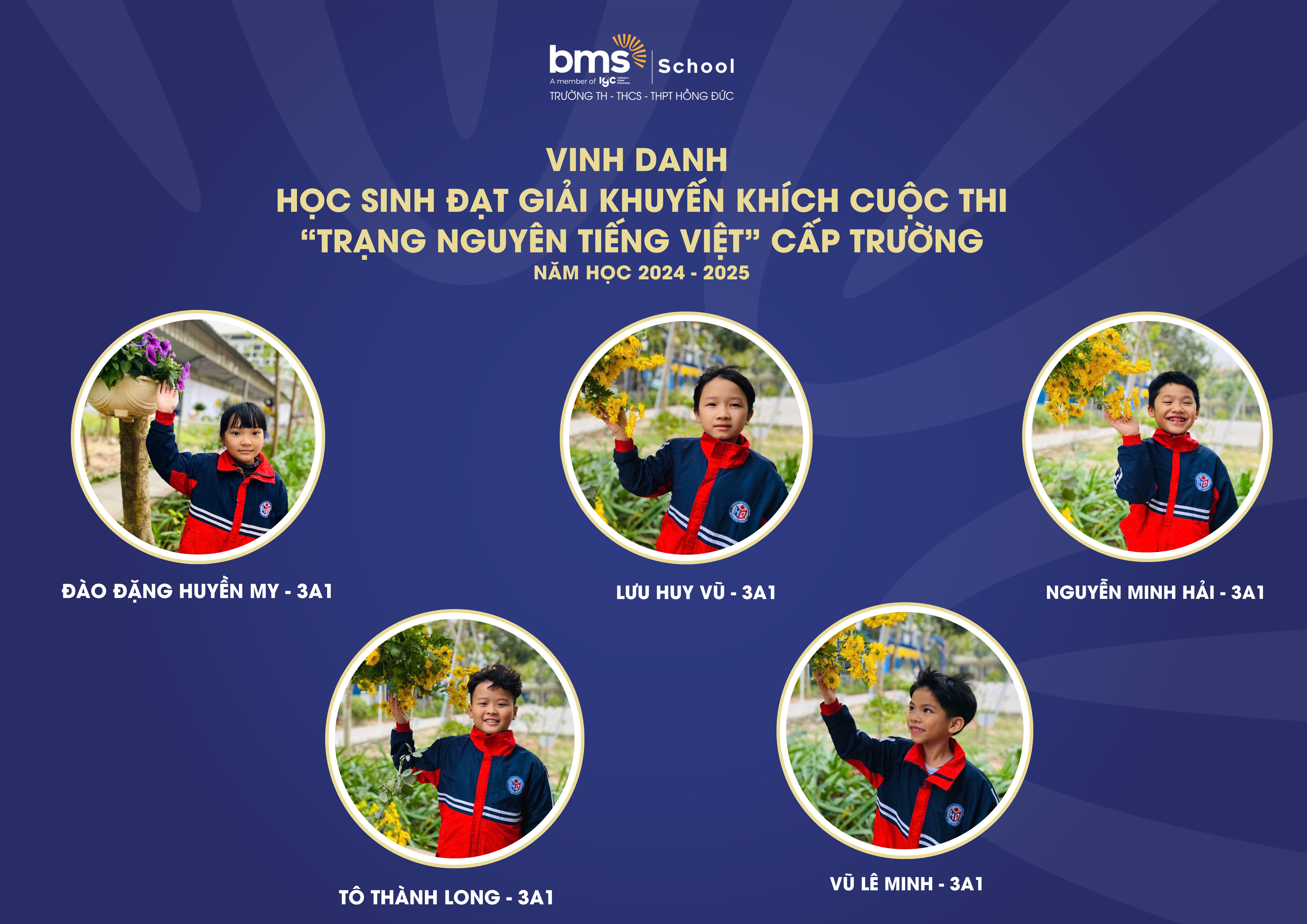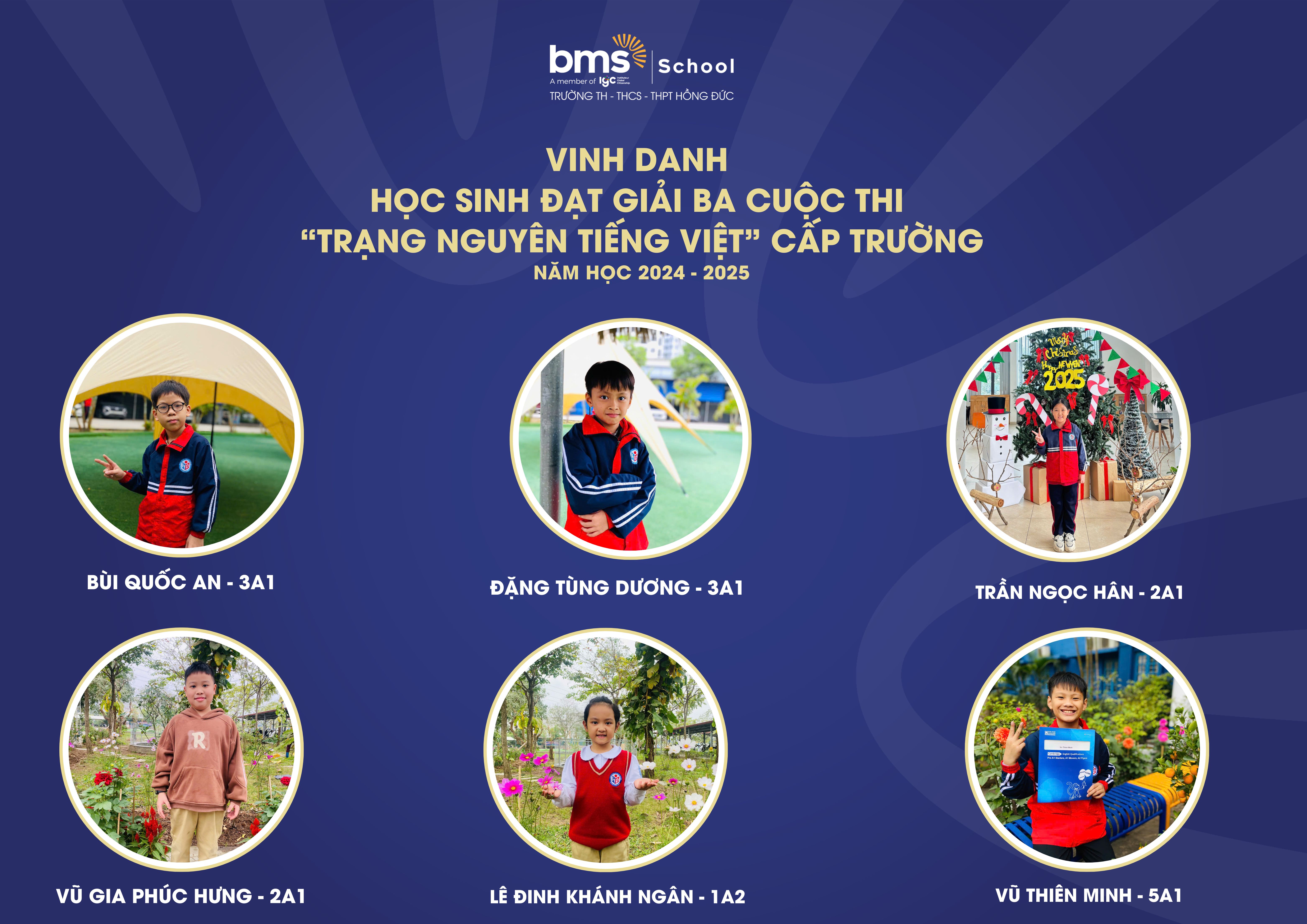 Kì thi Trạng Nguyên Tiếng Việt cấp Trường đã diễn ra thành công tốt đẹp, thu hút sự tham gia nhiệt tình và nghiêm túc của các BMSers Hưng Yên và đã gặt hái được những thành tích đáng tự hào với 7 giải Nhất, 9 giải Nhì, 12 giải Ba và 21 giải Khuyến khích như sau: